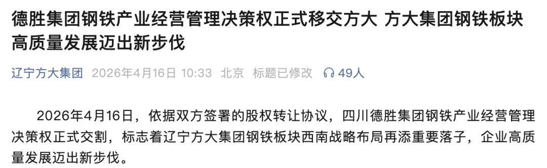 4月16日,辽宁方大集团(下称“辽宁方大”)官方微信发文称,依据双方签署的股权转让协议,四川德胜集团(下称“德胜集团”)钢铁产业经营管理决策权正式移交辽宁方大,“标志着集团钢铁板块西南战略布局再添重要落子,有助于优化钢铁板块区域布局”。