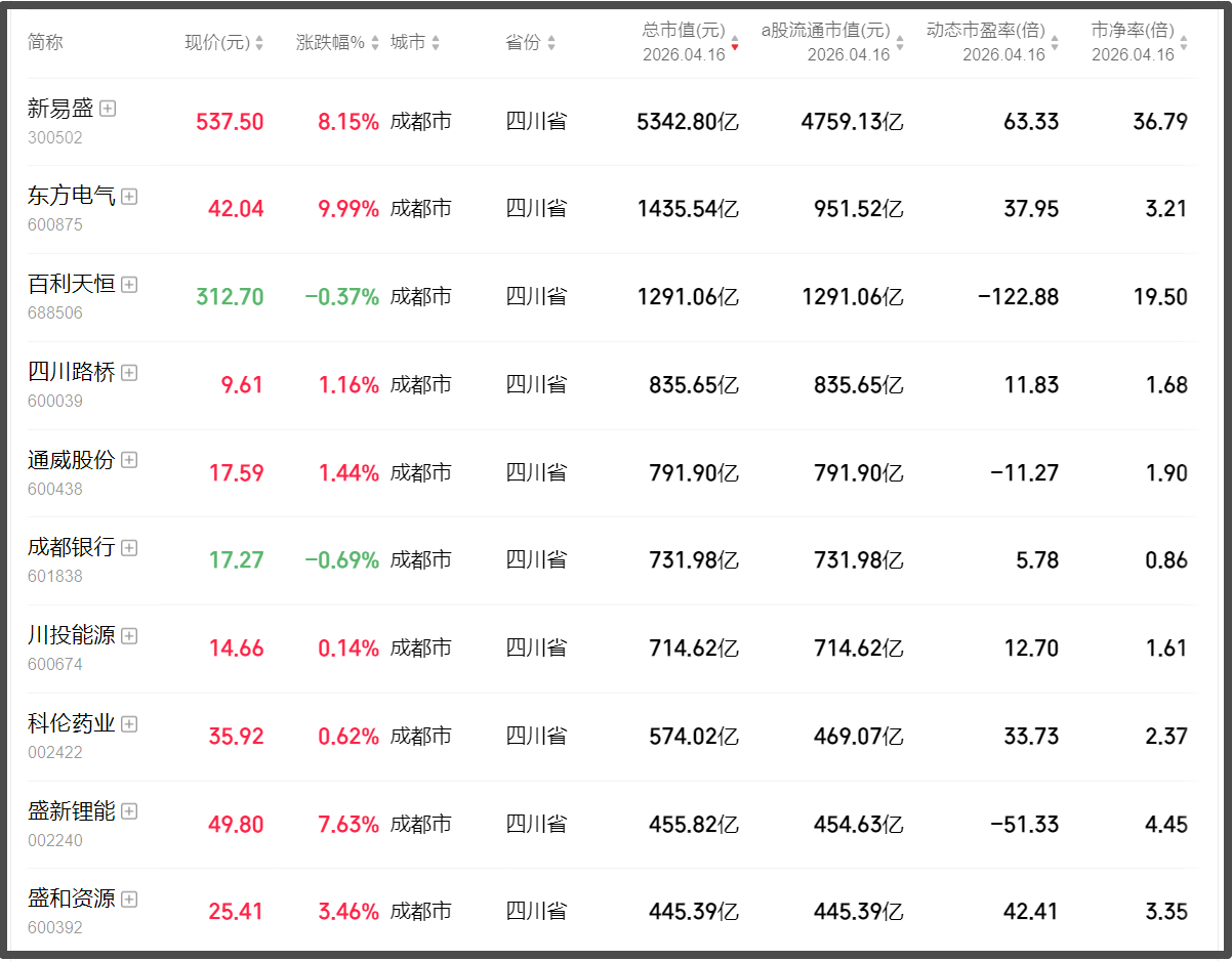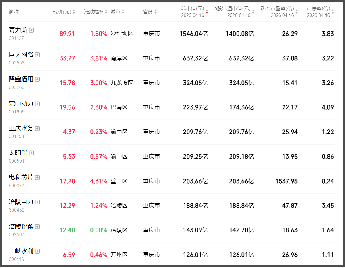 截止4月16日收盘,成都市A股上市公司数量为123家,总市值合计约2.25万亿元。同为西部“双子星”的重庆市,拥有上市公司79家,总市值超5800亿元,市值最高的赛力斯超过1500亿元。