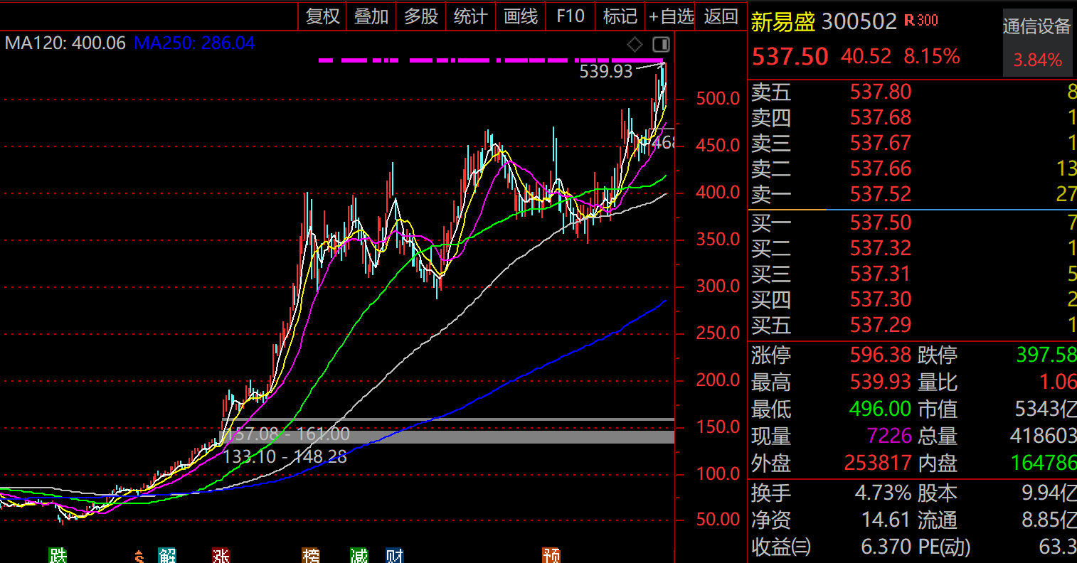 新易盛位于四川省成都市,近一年时间,新易盛股价从最低的46.56元飙升至539.93元,涨幅超过10倍,一跃成为成都市上市公司“一哥”。