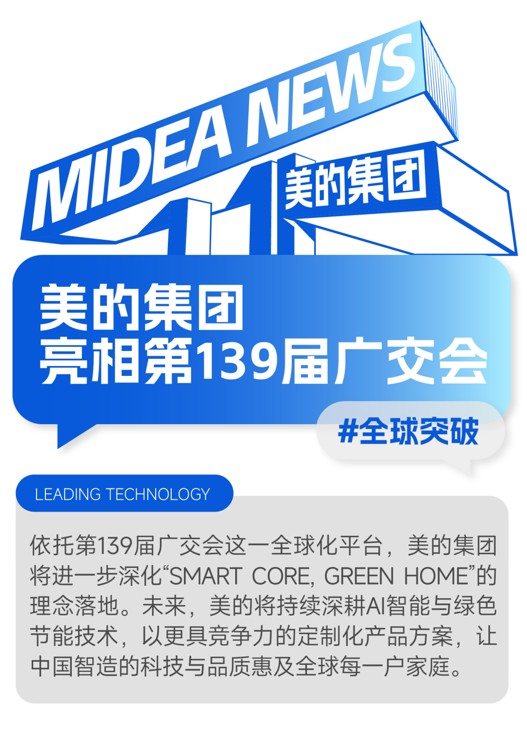依托第139届广交会这一全球化平台,美的集团将进一步深化“Smart Core, Green Home”的理念落地。未来,美的将持续深耕AI智能与绿色节能技术,以更具竞争力的定制化产品方案,让中国智造的科技与品质惠及全球每一户家庭。