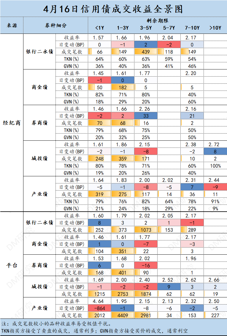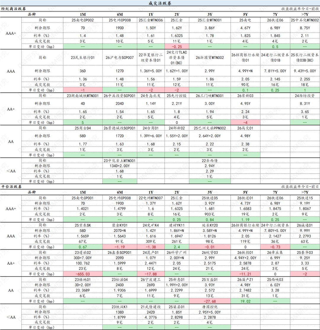 1)经纪商成交共计3064笔,1573只债券。其中银行二永债3-5Y区间交易最活跃,平均收益率约1.96%;其中商金债1-3Y区间交易最活跃,平均收益率约1.61%;其中券商债<1Y区间交易最活跃,平均收益率约1.46%;其中城投债1-3Y区间交易最活跃,平均收益率约1.86%;其中产业债<1Y区间交易最活跃,平均收益率约1.64%。