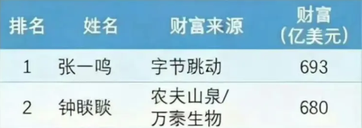 福布斯2026年年初公布的数据显示,中国首富张一鸣身家693亿美元,农夫山泉钟睒睒约680亿美元。