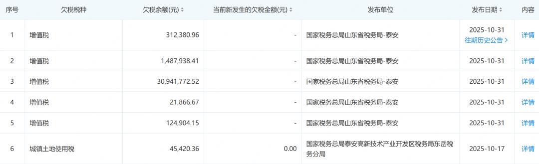 此外,山东泰山帝苑集团有限公司在2025年10月还涉及6起欠税信息,欠税税种为增值税和城镇土地使用税,经粗略计算,欠税金额约3293万元。