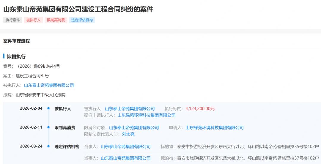 据查询信息显示,2026年2月4日,山东泰山帝苑集团有限公司新增被执行人信息,执行法院为泰安市中级人民法院,被执行总金额为412.32万元。涉及案件为建设工程合同纠纷,申请人为山东绿苑环境科技集团有限公司。因该案件,山东泰山帝苑集团有限公司及法定代表人刘太亮被限制高消费。