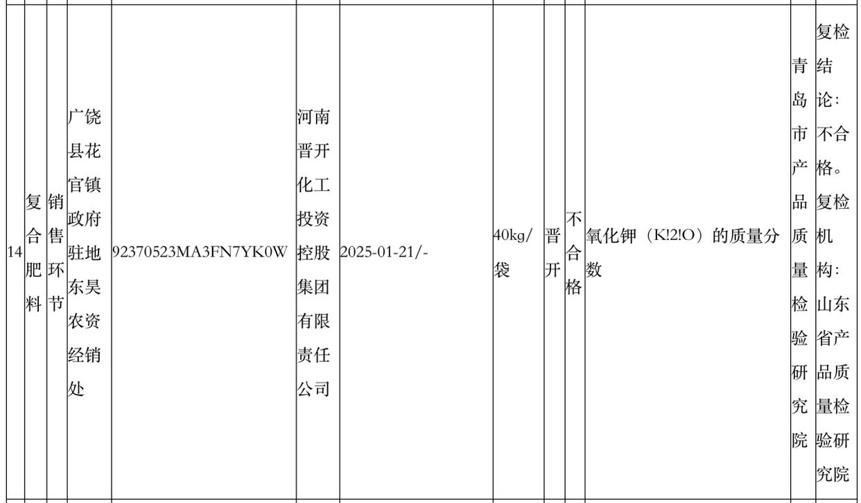 泰山财经记者获悉,近日,河南晋开化工投资控股集团有限责任公司(简称“河南晋开集团”)因生产的“晋升”品牌复合肥料“氧化钾(K!2!O)的质量分数”项目不合格被监管部门通报。值得注意的是,河南晋开集团对检验结果提出异议,并申请复检,复检后,结论依然为不合格。