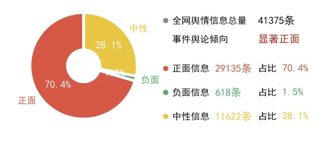 截止4月16日,此事件匹配的到全网舆情信息总量为41375条,正面信息29135条,占比70.4%,负面信息618条,占比1.5%,中性信息11622条,占比28.1%,事件舆论呈现出较为显著正面的倾向。