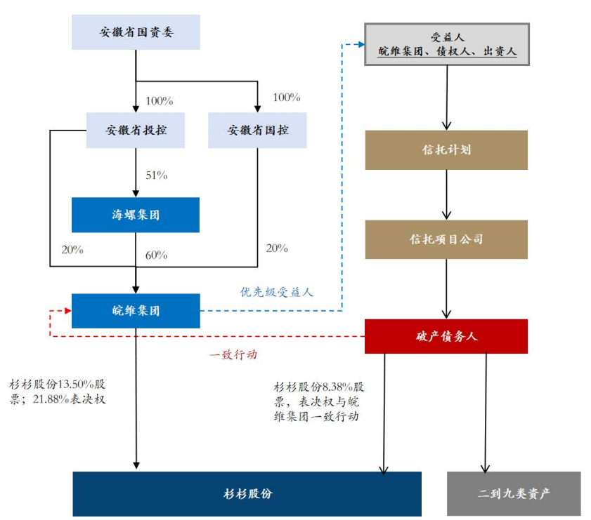 根据《重整计划(草案)》,重整投资人将通过直接收购股票和保留股票一致行动的安排合计控制债务人持有的 21.88%杉杉股份股票的表决权或与债务人达成一致行动。若本次重整成功,公司控股股东将变更为安徽皖维集团有限责任公司(以下简称“皖维集团”),公司实际控制人将变更为安徽省国资委。