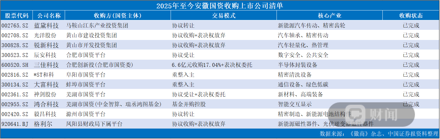 财闻注意到,2025年至今,安徽国资已陆续参与了10余家上市公司的收购,如蓝黛科技(002765.SZ)、光洋股份(002708.SZ)、毅昌科技(002420.SZ)、格利尔(920641.BJ)等,多数案例已完成控制权交割。
