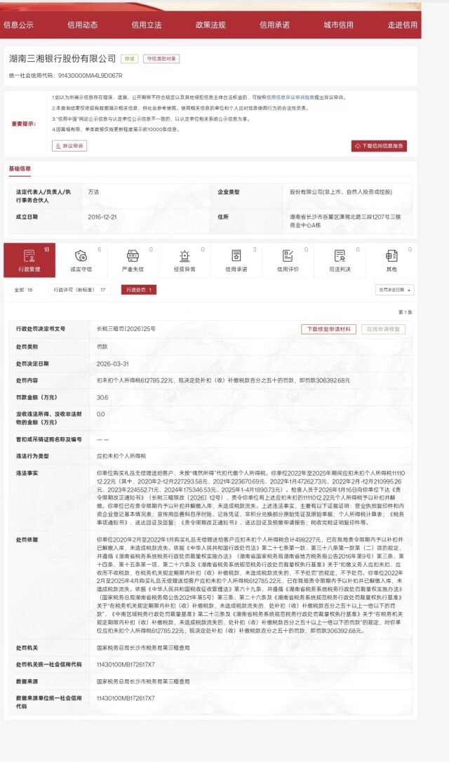 然而,在业务拓展过程中,营销环节的税务合规,却踩了监管红线。根据处罚详情,2020年2月至2025年4月,三湘银行累计应扣未扣个人所得税111.10万元。其中2020年2月至2022年1月的49.83万元已在限期内补扣解缴,未受处罚;而2022年2月至2025年4月的61.28万元虽同样完成补扣,却因超出整改期限,被处以补扣税款50%的罚款。