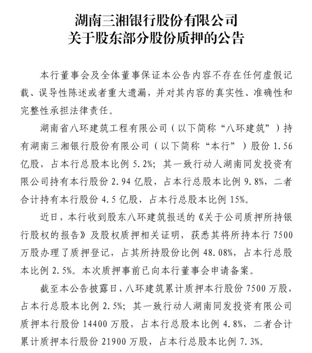 在业绩与合规压力之外,三湘银行还面临着股东质押与关联交易等深层挑战。