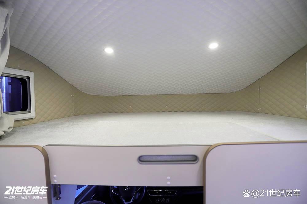 生活区采用对卡座沙发+卫生间+厨房吧台+侧沙发床的设计,2000x1300mm大额头床搭配1900x1100mm侧沙发床,后开门设计上下车更便捷,车内动线更合理,适合单人或双人长期旅居。