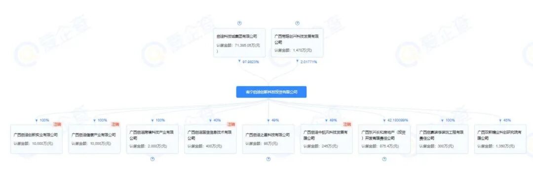 据悉,南宁启迪创新公司还是“开业”状态,其中启迪科技城集团有限公司占股97.9823%,广西带路创兴科技发展有限公司占股2.01771%。