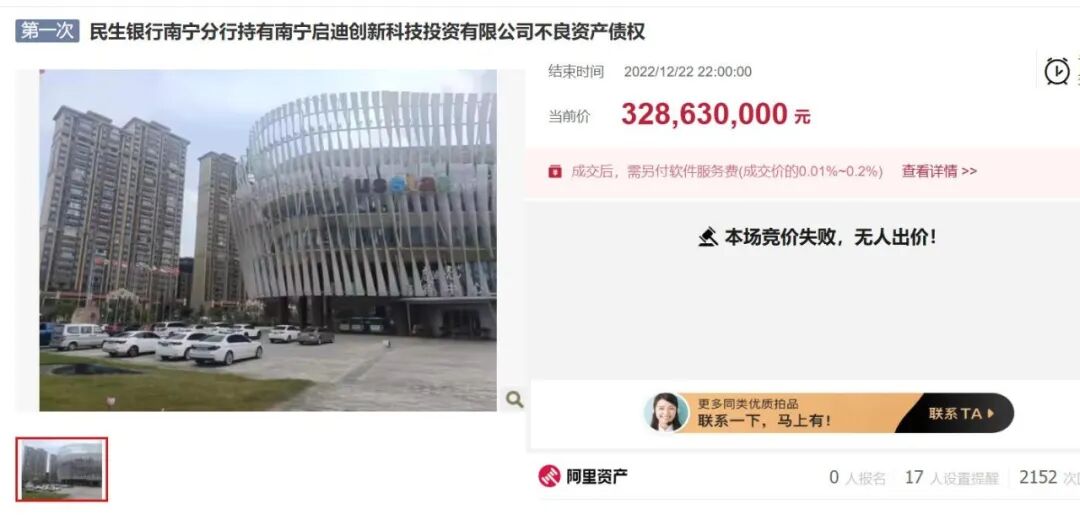 2022年12月,民生银行南宁分行将南宁启迪创新科技投资有限公司(下称"南宁启迪创新公司")资产债权转让,涉及金额约3.29亿元。