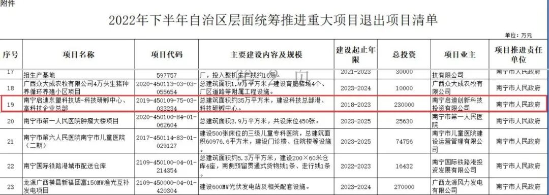 到了2022年,下半年自治区层面统筹推进重大项目退出项目清单中,南宁启迪东盟科技城-科技研孵中心、高科技企业总部赫然在列。