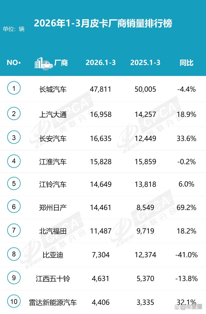 再看1-3月的皮卡销量排行,长安汽车销量超1.66万辆、同比增长33.6%,郑州日产销量超1.44万辆、同比增长69.2%,走势较为积极。