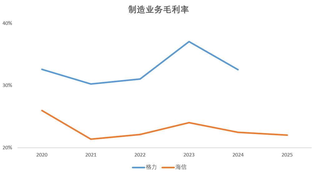财报数据很直接,从2020年到2024年,格力的毛利率稳定在30%以上,而海信则略有差距。