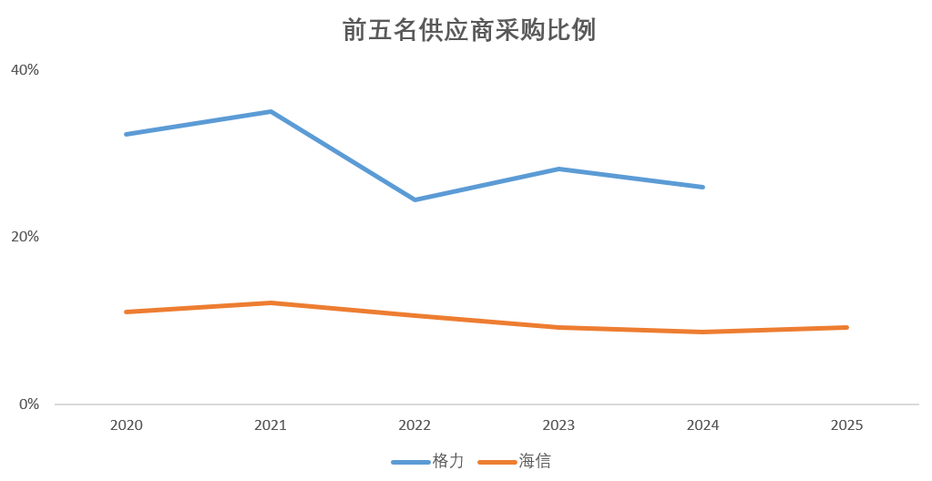 其强大的内生消化能力,直接体现在了其对外部供应链的依赖程度上——格力前五名供应商的采购比例常年维持在25%~35%之间,反观海信,其比例则始终处于10%左右的极低水平。