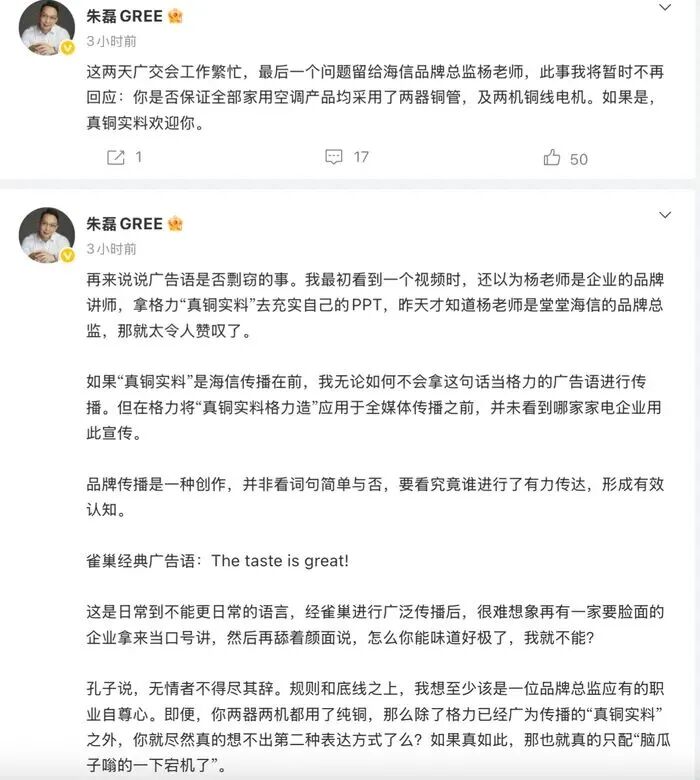 4月15日,针对朱磊的言论,海信空气事业部品牌总监杨祥玺则发布视频回怼称“竟然狂到把一个形容词据为己有的程度”,并且说十年前包括海信、长虹在内的多家空调企业就已经强调要“真铜实料”。
