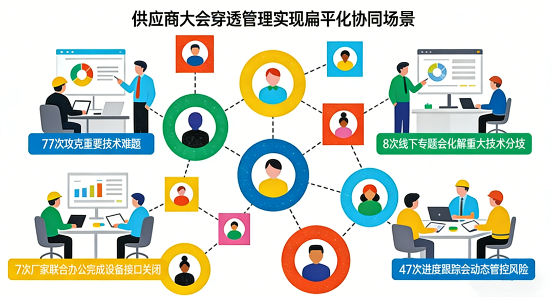 攻关组共组织召开各类会议200余次:以供应商大会穿透管理,实现扁平化协同,开展技术交流77次,攻克重要技术难题;通过8次线下专题会,化解PV13、SG管道技术条件等重大技术分歧;组织厂家联合办公7次,完成燃料操作装置等重要设备接口的关闭;每日通报进展、召开进度跟踪会47次,动态跟踪管控风险,实时疏通堵点,实现专项计划IED(设备工程文件索引)关闭率94.64%,每周关闭数量提升47%;专项计划ICM(接口控制手册)关闭率98.98%,每周关闭数量提升54%。