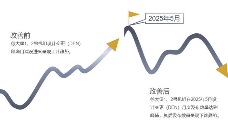 从项目重启前设计变更梳理,夯实基础;建立模块长制度及系列攻关措施,针对模块的土建接口、设备接口、力学接口以及上下游文件的一致性等方面进行全面核查;派遣有经验的设计人员赴模块制造厂,开展现场设计技术服务工作,解决现场技术问题;成立核岛三维检碰及一致性核查小组;协调中核工程郑州分公司总经理带领设计攻关团队20人赴现场攻关,组织各参建方召开RC(现浇混凝土墙)优化专题会、主蒸汽管道引入专题会等多项专题会32次,解决议题102项,形成并快速落实行动项36项。通过采取系列管控措施,徐大堡1、2号机组项目设计变更于2025年5月达峰,之后每月发布数量持续降低。