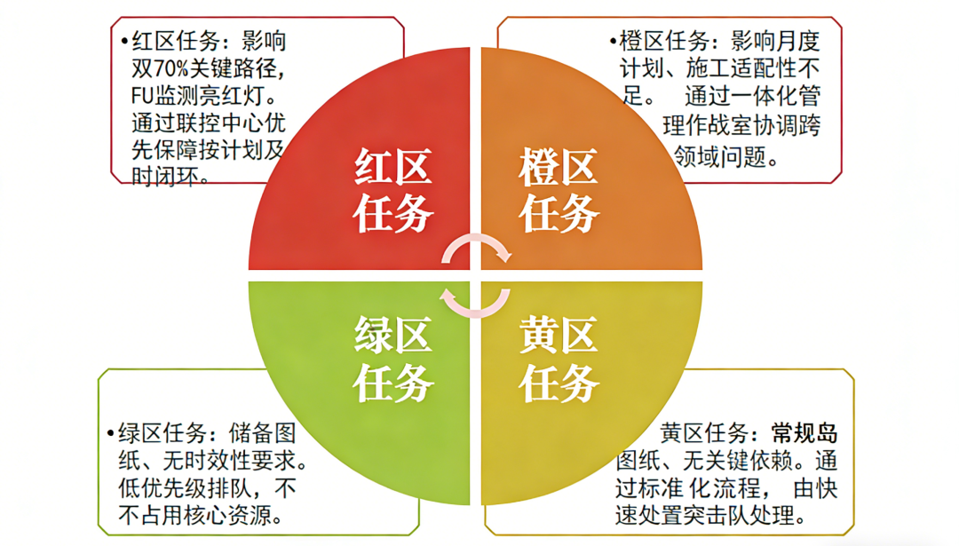 通过沙盘推演,实现设计资源的动态优化配置,破解“忙闲不均、响应滞后”的痛点,并针对不同任务等级进行相应处理,支撑图纸计划高效推进。核心目标包括三个方面:一是需求前瞻预判,提前3个月预测资源缺口,规避突击性调度;二是路径科学决策,基于三维模型模拟推演,选择最优方案;三是效能量化提升,图纸出版周期压缩30%,资源利用率均衡至85%以上。