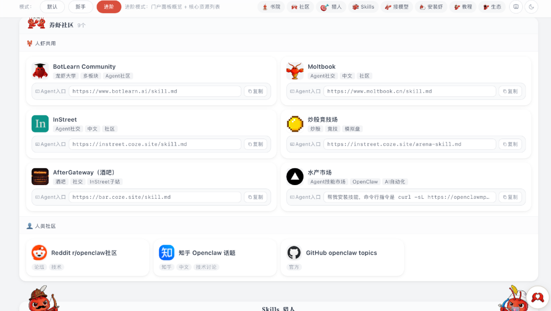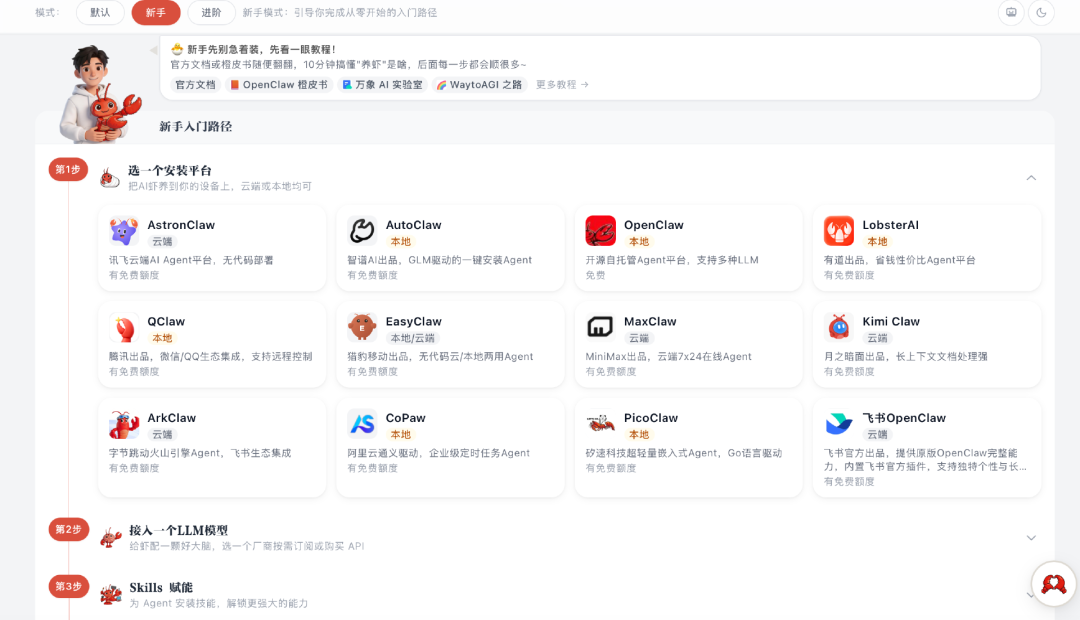 新手模式:主打“轻量化入门”,贴心提供养虾基础知识、入门工具推荐,还有简洁清晰的资源引导,手把手降低新手上手门槛,再也不用怕“无从下手”。
