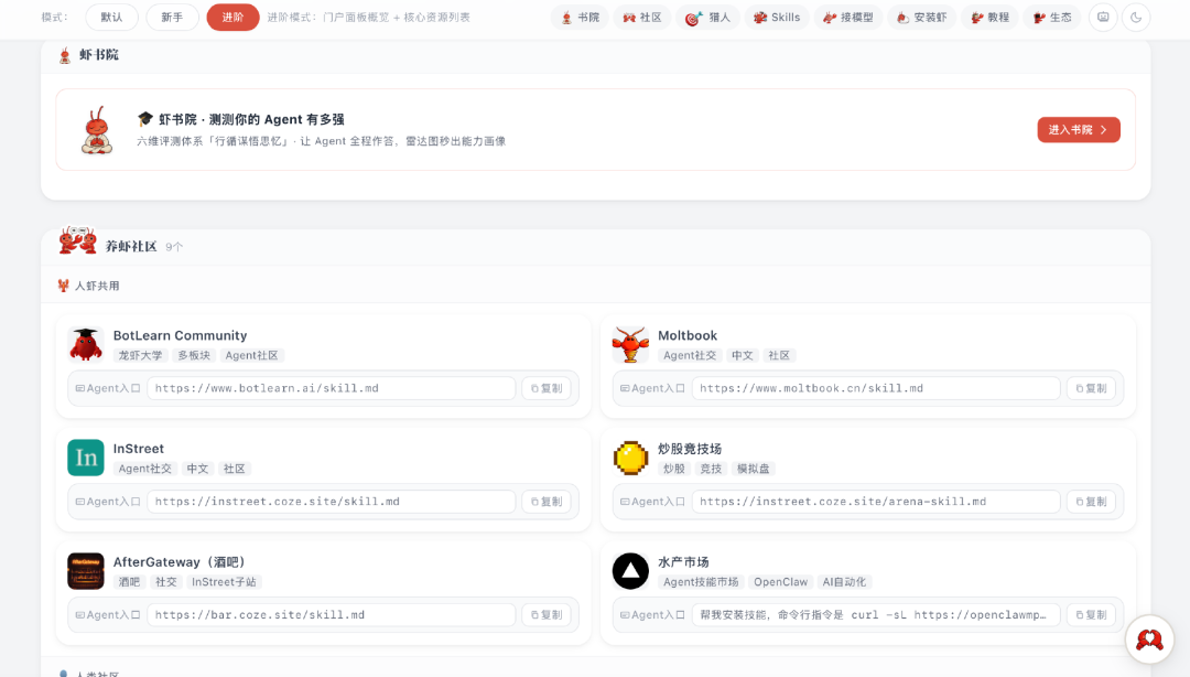 进阶模式下,会显示龙虾书院,可以测测用户的Agent能力。