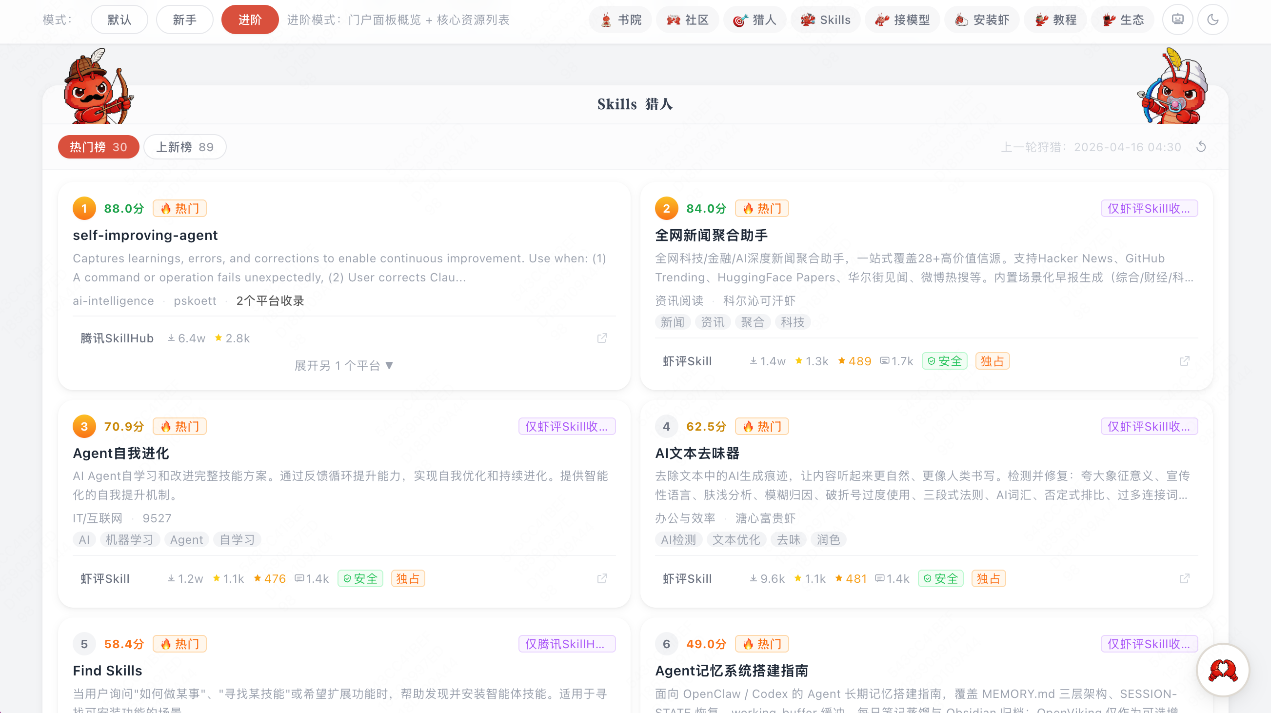 虾345内置Skill Hunter功能,跨平台聚合、筛选优质技能内容,一站式呈现高价值Skill资源——你不用再一个个去 SkillHub、ClawHub 挨个翻,直接在虾345看哪个 Skill 更热门、评分更高、更多人在用。大幅节省筛选时间,降低学习与使用成本。