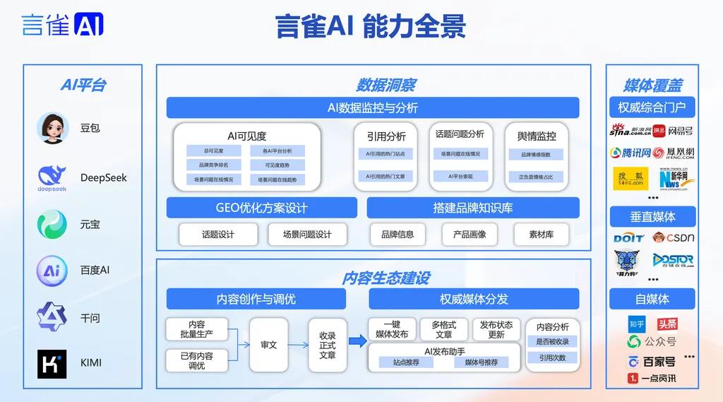 言雀AI已覆盖国内六大主流AI平台,包括豆包、元宝、千问、Deepseek、百度AI和Kimi。提供全流程GEO解决方案:从优化方案设计、品牌知识库搭建,到内容创作、权威媒体分发,再到AI数据监控、可见度追踪、舆情管理、获客转化,已形成完整闭环。