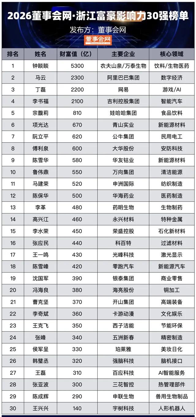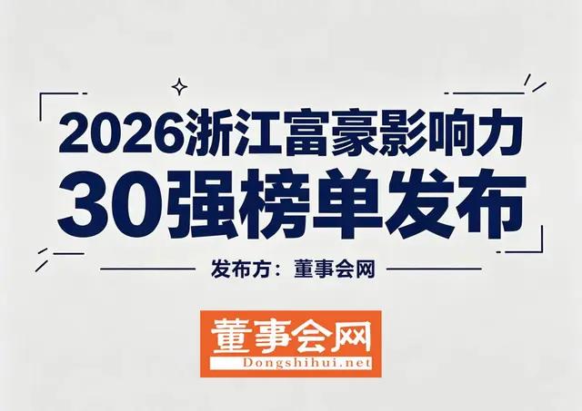 2026年4月16日,董事会网(dongshihui.net)作为国内最大的董事会财经新媒体,以企业财富规模、公司市值(估值)、行业领导力、社会责任贡献四大核心维度,正式发布《2026浙江富豪影响力30强》榜单。