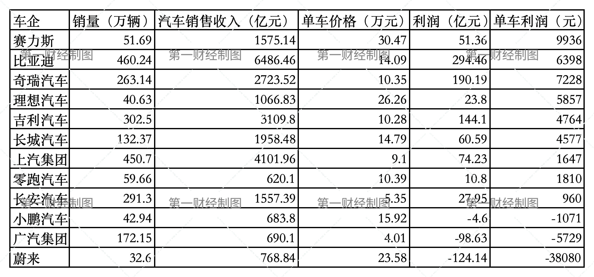 理想和蔚来的单车价格也较高,均在25万元以上。不过,这两家车企的单车盈利水平存在差异。蔚来是12家车企中单车亏损最大的企业,按照Non-GAAP利润计算,蔚来单车亏损约3.8万元,亏损额较此前已大幅收窄,理想的单车利润则为5857元。