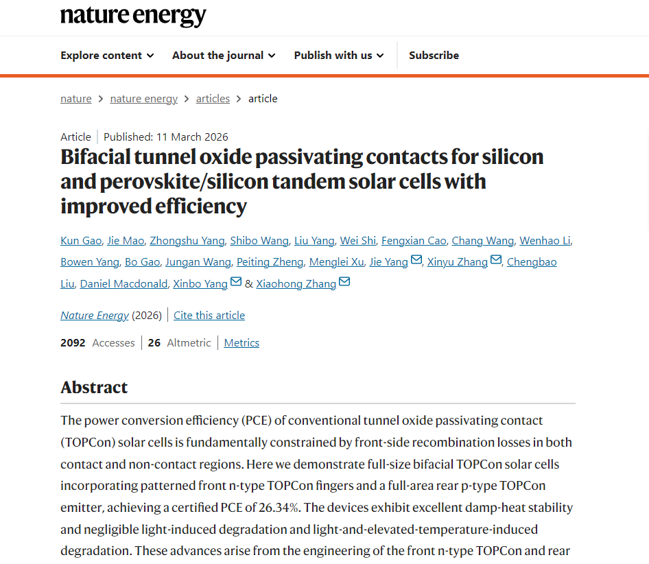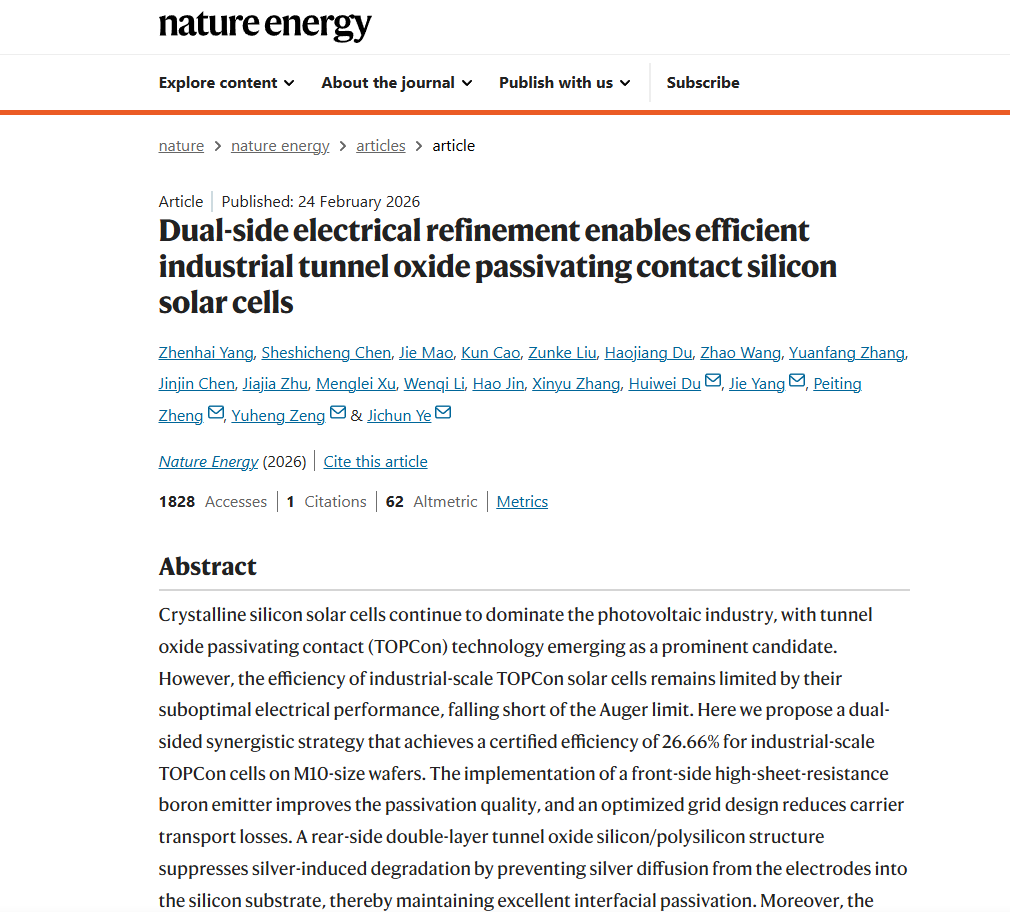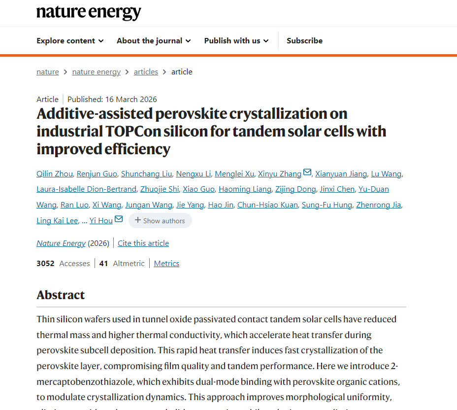 近日,全球领先的光储企业晶科能源联合中国科学院宁波材料技术与工程研究所、苏州大学以及新加坡国立大学等国内外顶尖科研机构,在国际著名学术期刊《Nature Energy》上,于一个月内连续发表三篇研究成果,系列论文展示了晶科在TOPCon及钙钛矿叠层电池技术领域的多项重大突破。