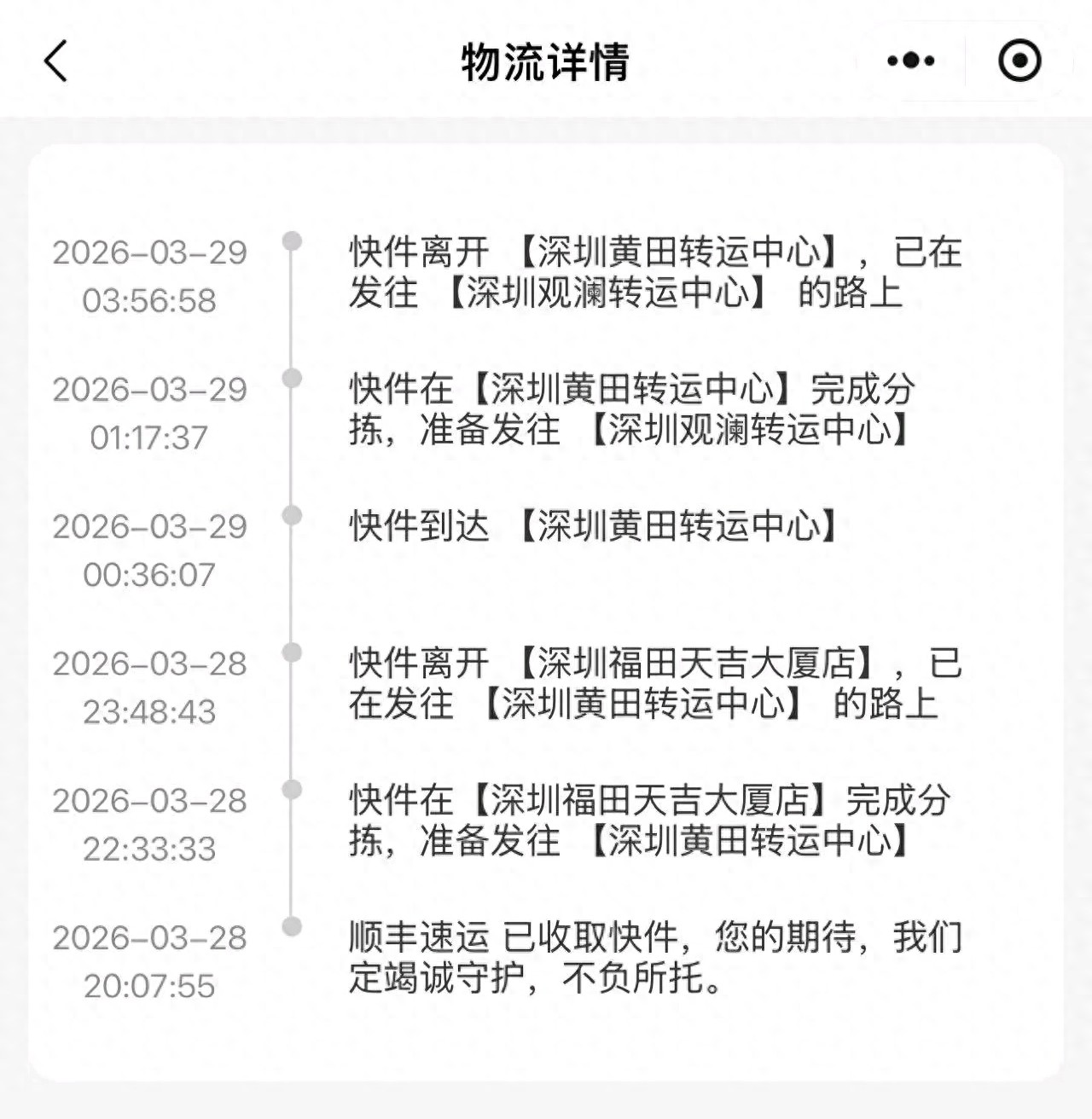 快件记录显示,3月28日20:07:55,顺丰速运从深圳福田天吉大厦店收取了一个快件:22:33:33,在网点完成分拣发出;23:48:43,到达深圳黄田转运中心;次日(3月29日)凌晨00:36:07,完成分拣;01:17:37,离开黄田转运中心发往观澜转运中心。
