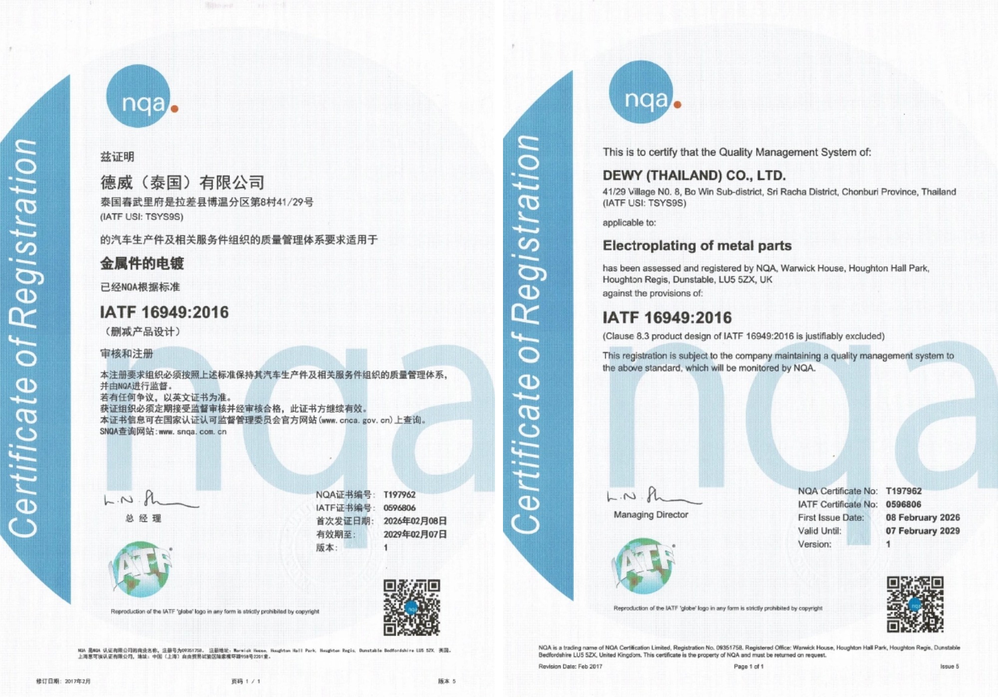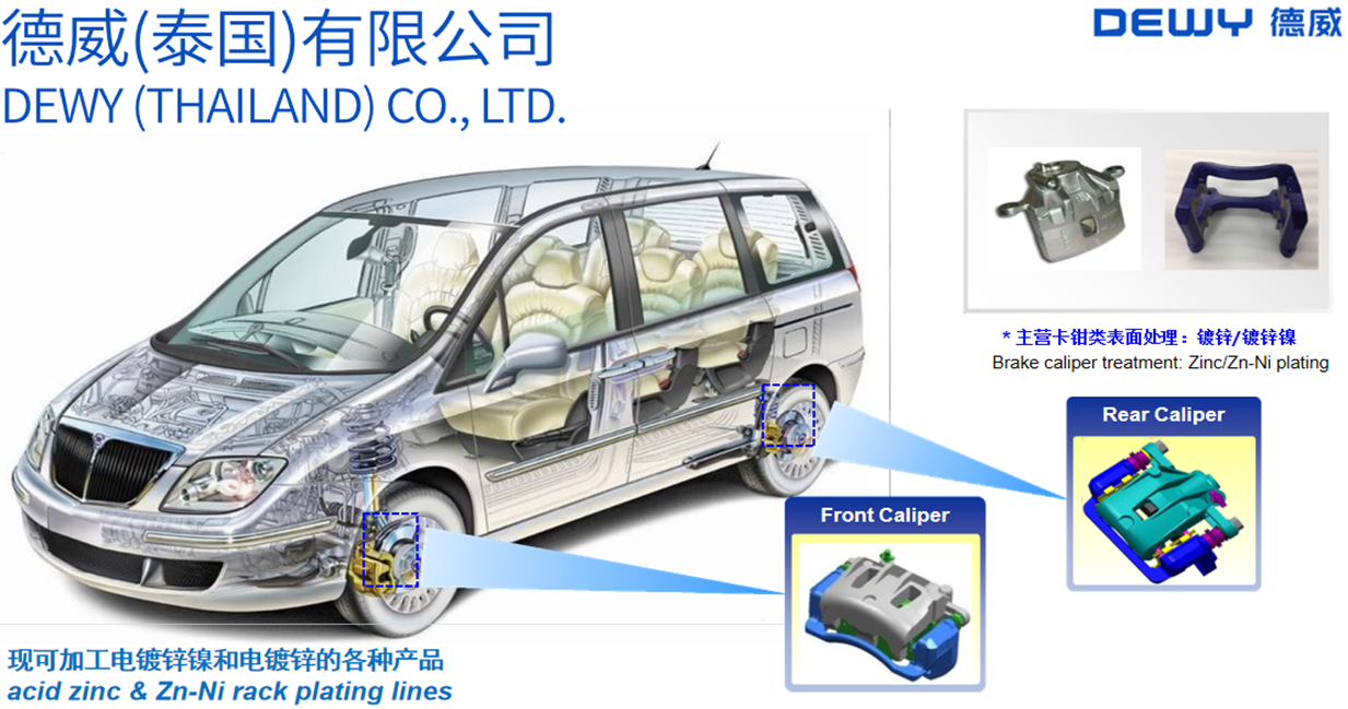 Located in Bowin Sub-District, Sriracha District, Chonburi, Dewy (Thailand) is invested and established by Tianjin Dewy Metal Surface Treatment Co., Ltd., with the build-up area of 8,000sqm, mainly engaging in plating surface treatment, and now can manufacture various products through automatic acid zinc & Zn-Ni rack plating lines. Committed to be a metal surface treatment leader, we’ve served such end users as Hyundai, Toyota, Volvo, VW, SAIC, KIA, Benz, BMW, GM, Great Wall, Geely, Wuling, Baojun and LIFAN, etc.