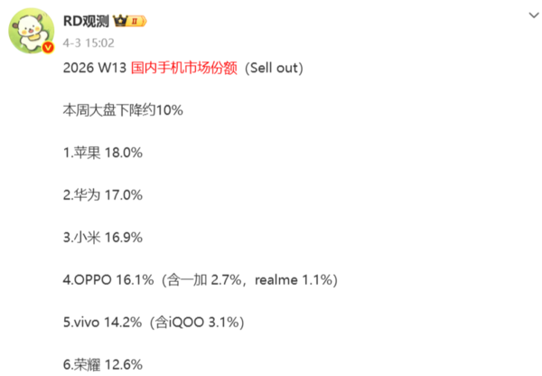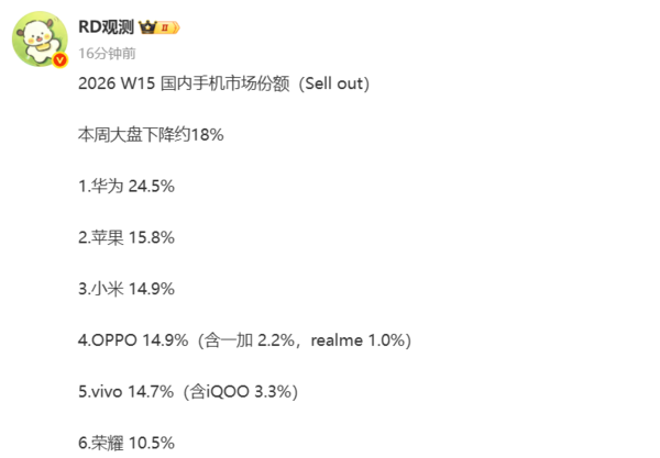 4月17日,据数码博主“RD观测”透露,2026年第15周国内手机市场份额大盘下降约18%。