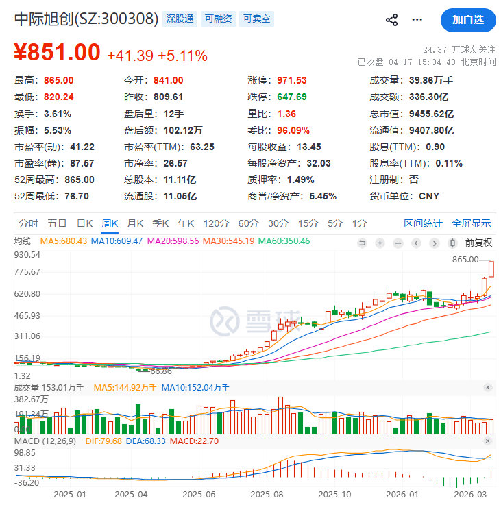 二级市场上,中际旭创今日股价猛涨5.11%,报收851元/股,市值站上9455.6亿元,离万亿越来越近了。近一年来,中际旭创股价已翻7倍,累计涨近767%。