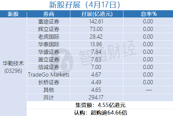 智通财经APP获悉,华勤技术(03296)正在招股中。截至4月17日,富途证券、辉立证券等券商为华勤技术借出294.17亿港元,超购逾64.66倍。