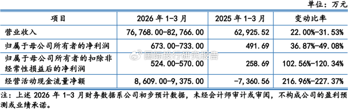 经初步测算,公司2026年1-3月业绩预测情况如下: