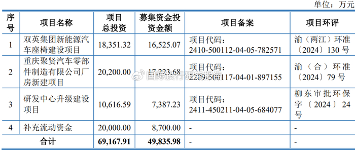 本次广西双英集团IPO拟募集资金4.98亿元,主要用于新能源汽车座椅产能建设项目、研发中心升级建设项目、重庆聚贤厂房新建项目以及补充流动资金,具体如下:双英股份是一家