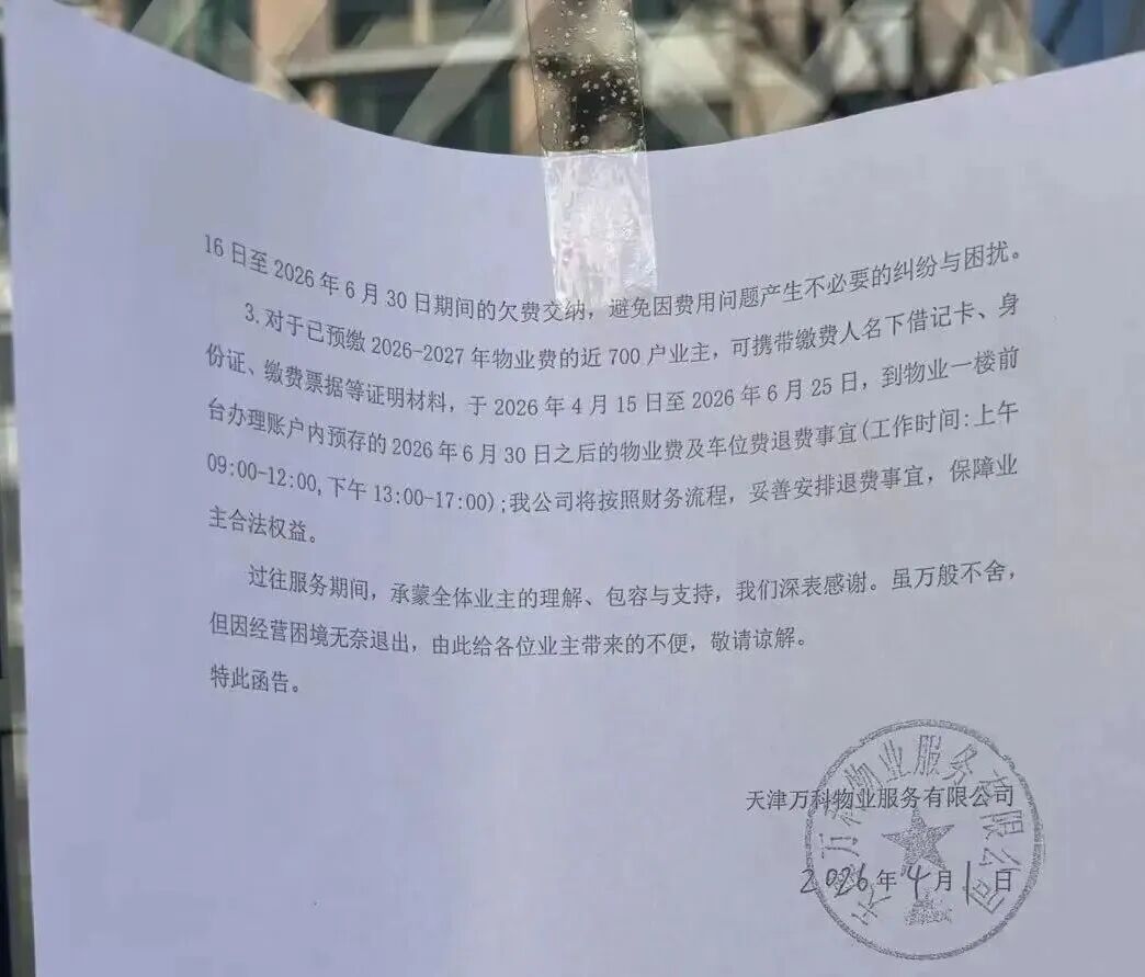经审慎研究,万科物业不得不做出艰难决定,计划于2026年6月30日正式终止该小区的全部服务,并同步抄送属地街道。