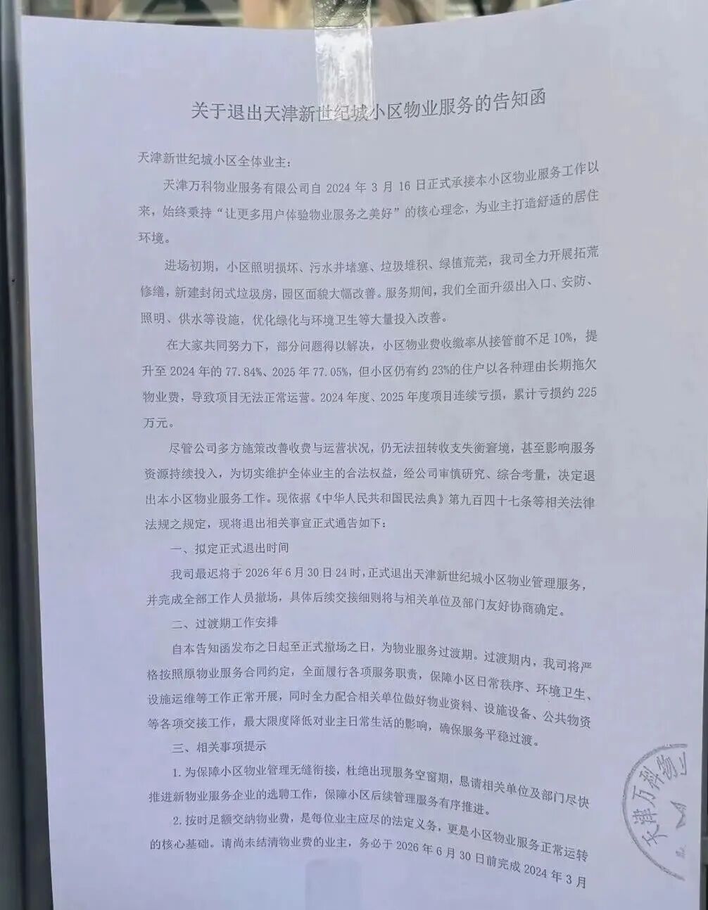 日前,天津新世纪城小区的业主也收到了天津万科物业服务有限公司的一纸“退场告知函”。