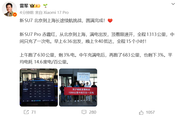 4月18日,雷军发长文总结:“这是一次‘疯狂’的挑战。开新一代SU7,清晨6:35从北京满电出发,一路开到上海,21:40抵达上海5G未来中心,全程预估1265公里,实际跑了1313公里,顶着限速跑,百公里电耗14.6kWh,剩余电量3%,预估续航还剩19公里。中间仅在山东临沭休息区充了一次电,挑战成功!”