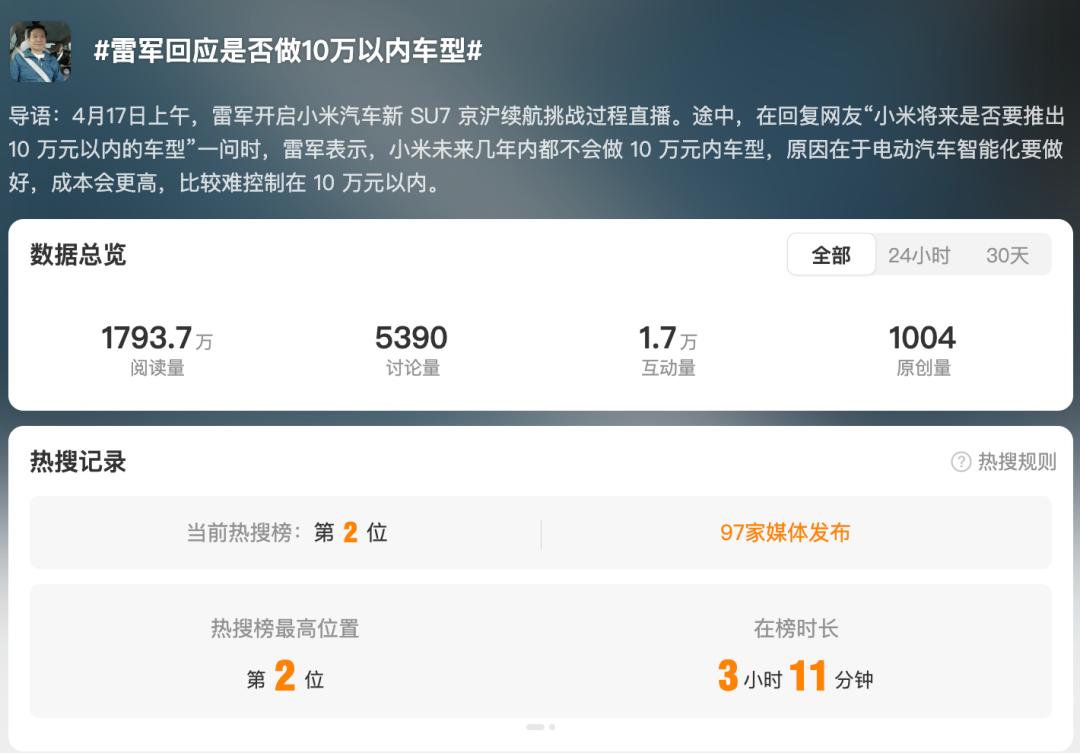 4月17日,#雷军达成京沪高速只充一次电#登上热搜。一场“疯狂”的续航测试,让57岁的千亿总裁在车里跟网友说了一整天。