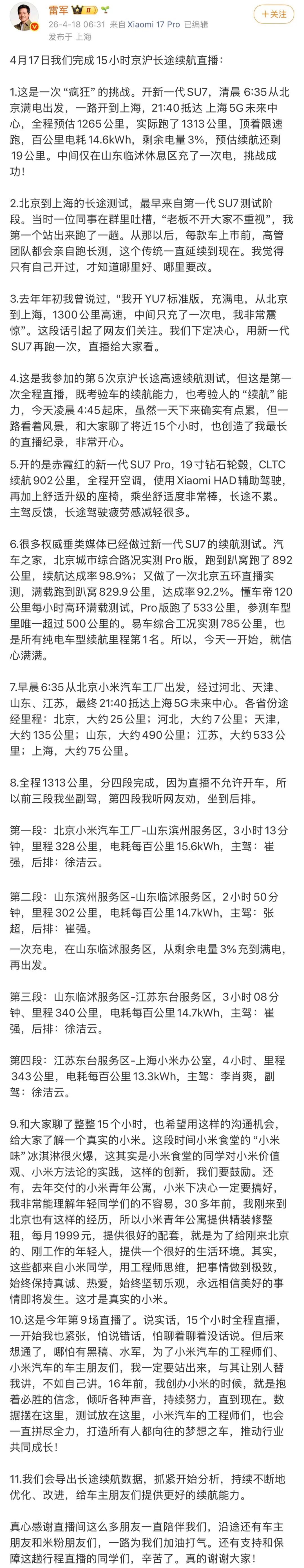 57岁千亿总裁拼了!雷军15小时直播驾车,京沪高速“只充一次电”挑战成功,次日凌晨发文总结