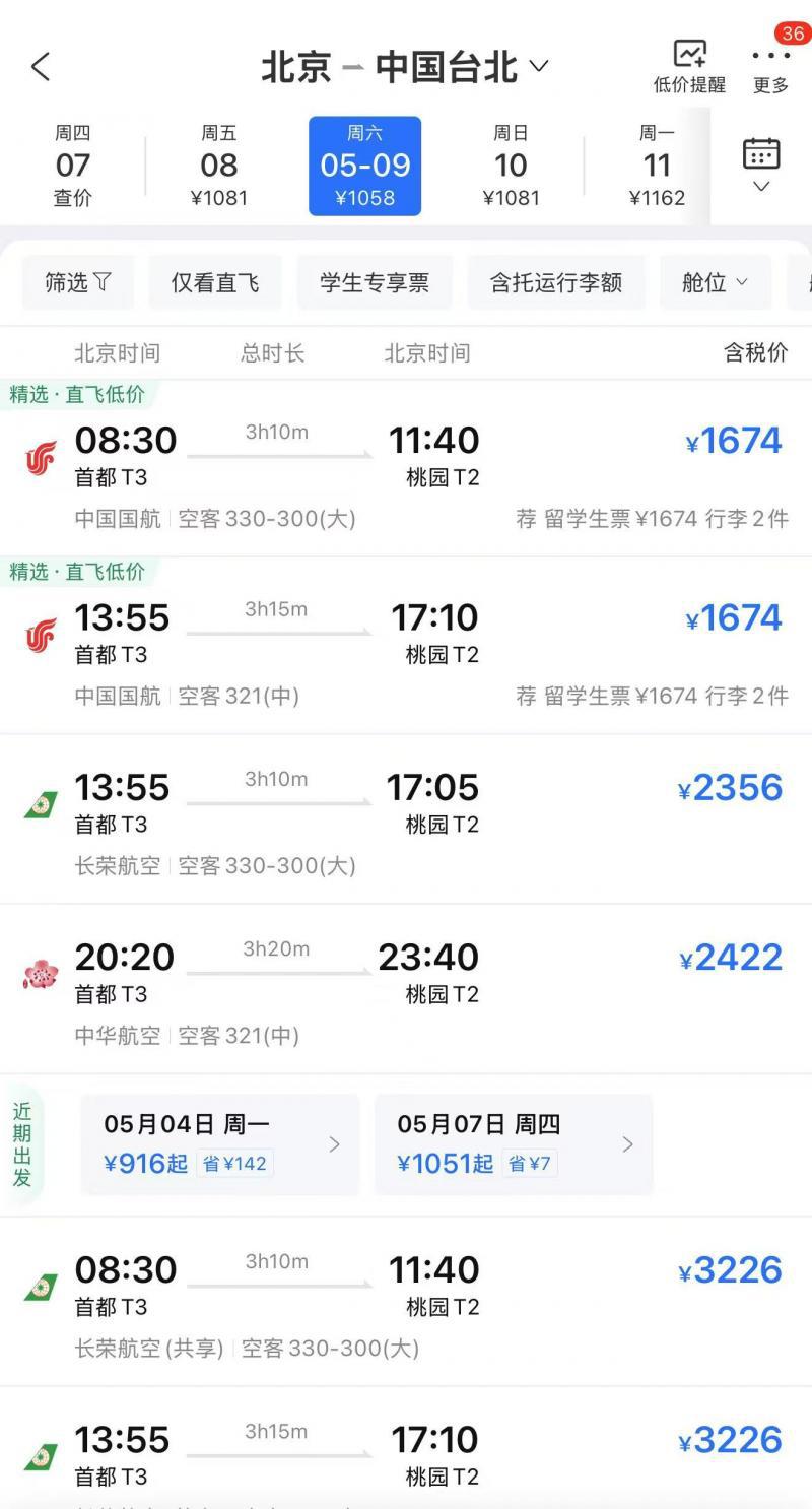 北京直飞台湾航线每周29班,多条两岸航线将复航