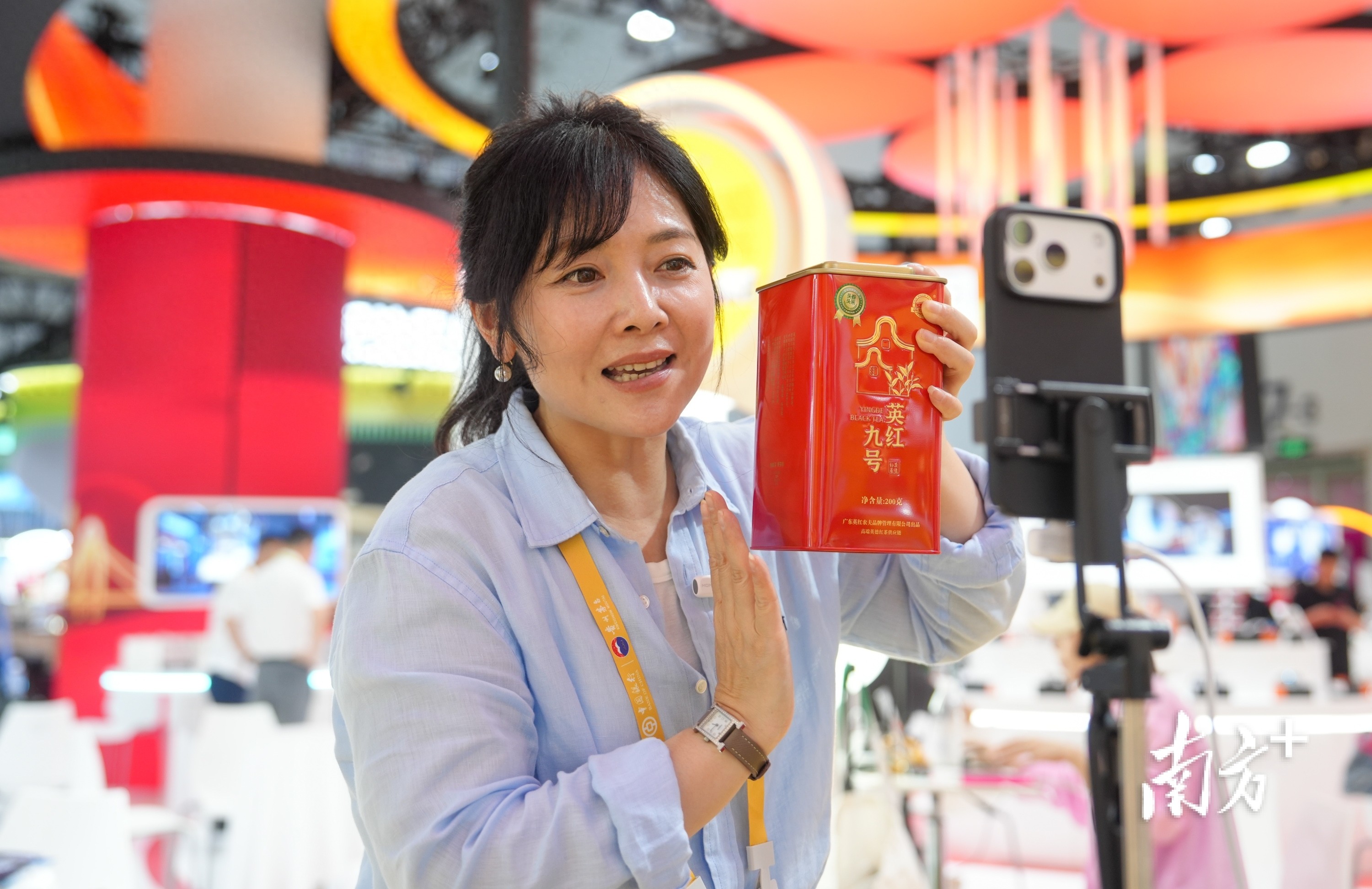 广东展馆内,英德红茶展位工作人员正在进行现场直播。张令摄