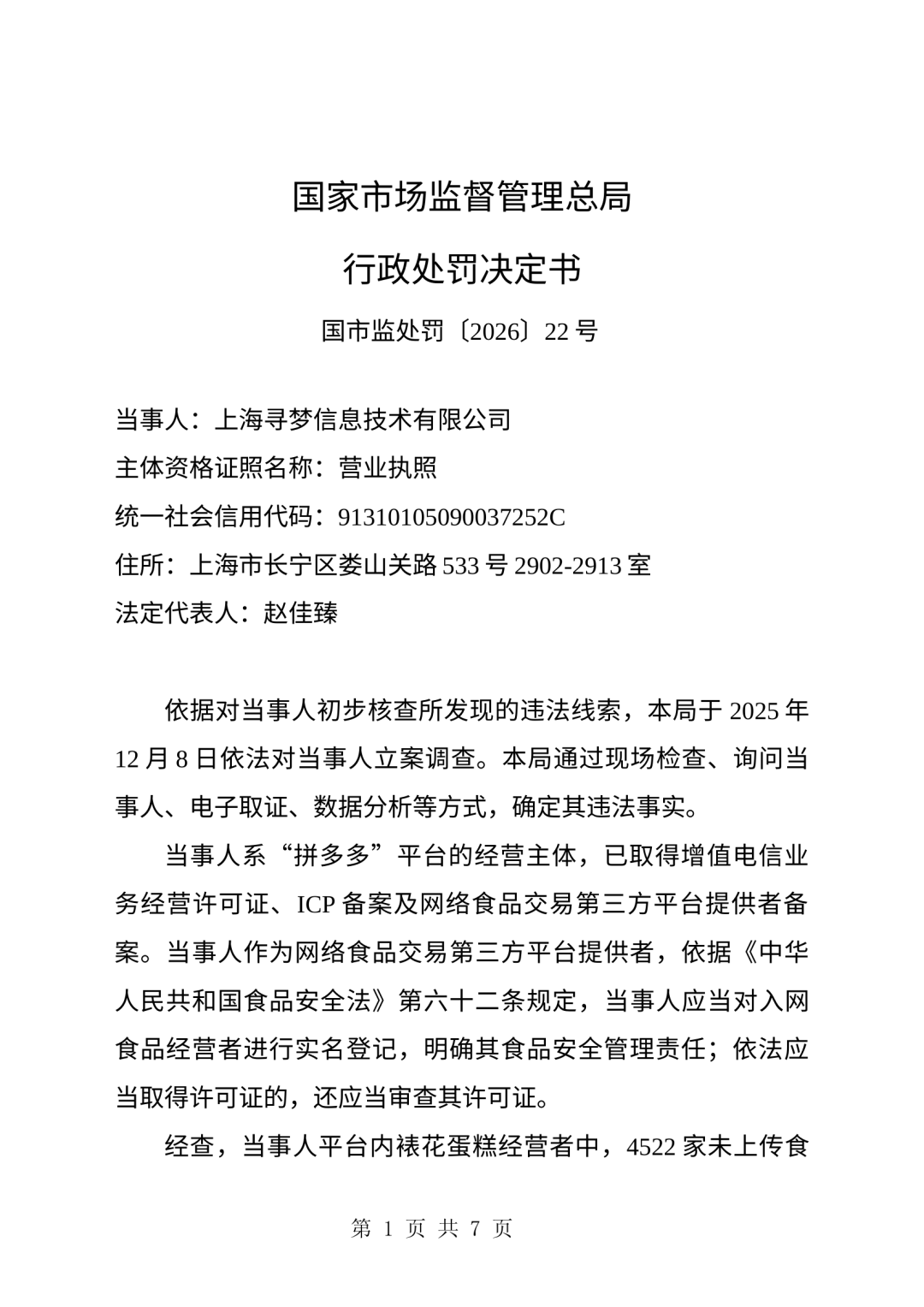 2026年4月17日,国家市场监督管理总局正式公布了对上海寻梦信息技术有限公司(拼多多平台经营主体)的行政处罚决定书(国市监处罚〔2026〕22号),罚没合计高达15.22亿元,同时责令暂停新增蛋糕(预包装除外)店铺9个月。