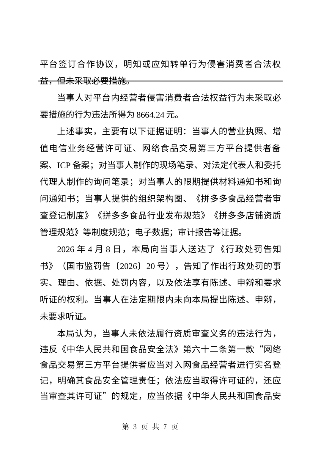 市场监管总局认定,拼多多作为平台,"明知或应知"上述转单行为侵害消费者合法权益,却未依法采取必要措施。平台违法所得为8,664.24元(约8664元)。