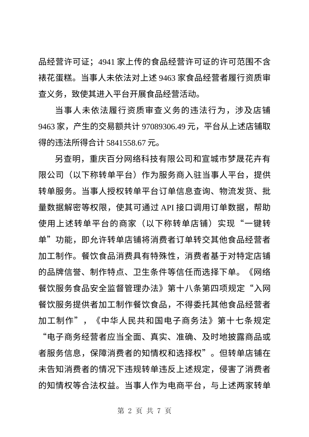 拼多多与两家转单平台(重庆百分网络科技有限公司、宣城市梦晟花卉有限公司)签订合作协议,授权其调用订单数据查询、物流发货、批量数据解密等API接口权限,帮助平台商家实现"一键转单"功能——即允许转单店铺将消费者订单转交其他食品经营者加工制作,而消费者对此并不知情。