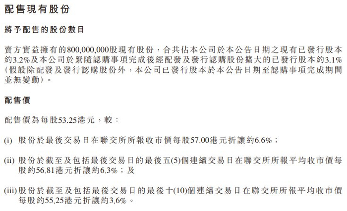25日,小米集团在港交所公告,拟每股53.25港元配售8亿股现有股份,配售价较最新收盘价57港元折让约6.6%,预计筹资净额约425亿港元。